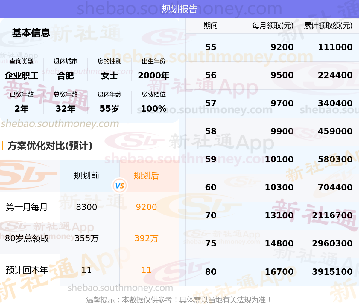 规划前:参保城市:合肥,性别:女士,出生年月:2000,已缴年限:2年,总缴年数:32年,退休年龄:55岁,缴费档位:100%。