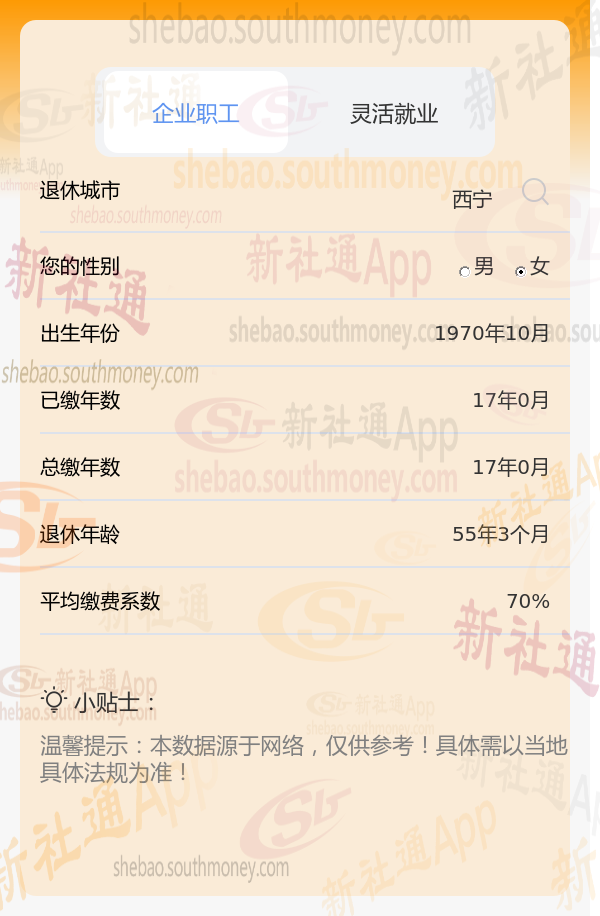 秦某一位1970年出生的女性,目前定居在风景秀丽的青海西宁并享受着退休生活。她的社会保险缴纳年限是17年,且一直以较高的70%档次进行缴费,展现了她对未来生活的充分规划与准备。