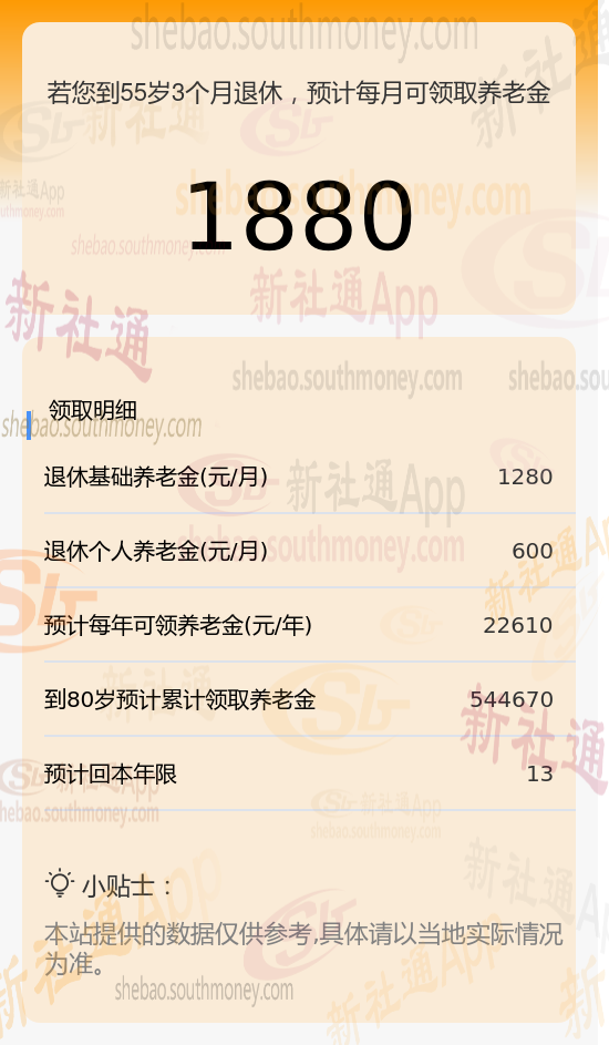基础养老金=(参保人员退休时当地上年度在岗职工月平均工资+本人指数化月平均缴费工资)÷2×缴费年限×1%通过公式计算出每月大约1280元。