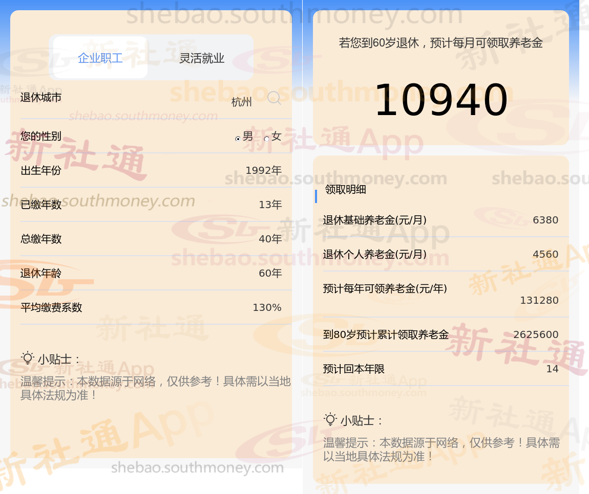 通过新社通APP-养老金计算所得:退休城市、出生年份、退休年龄、缴费系数都相同的情况下,社保缴费年限累计40年时,计算如下: