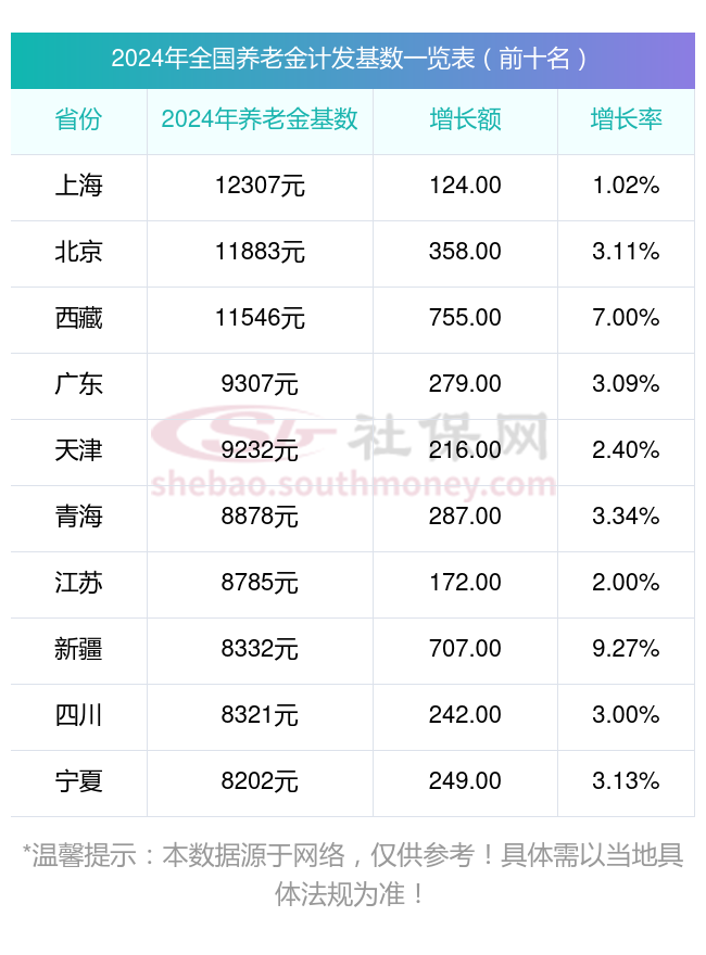 上海位列第一,养老金计发基数达到12307.00元,增长率为1.02%;