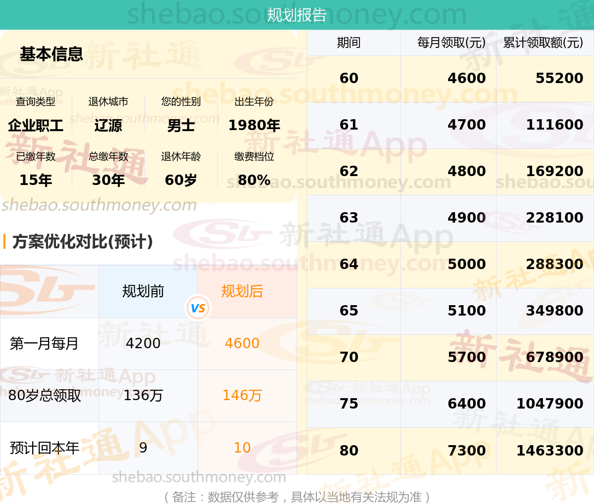 规划前:60岁第一个月约领4200元,新社通APP-养老金规划后:60岁第一个月约领4600元