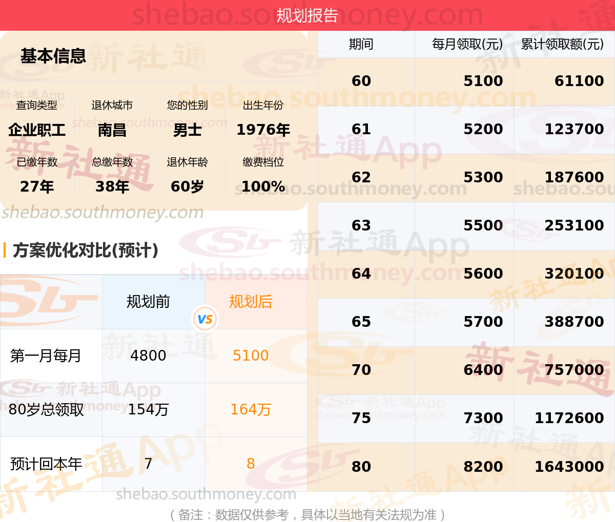 规划前:60岁约领4800元,新社通APP-养老金规划后:60岁约领5100元