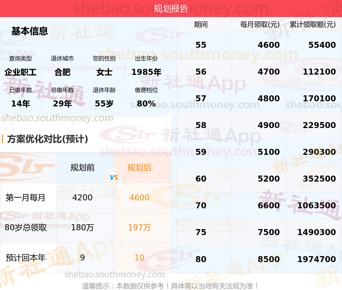 规划前:55岁第一个月约领4200元,新社通APP-养老金规划后:55岁第一个月约领4600元