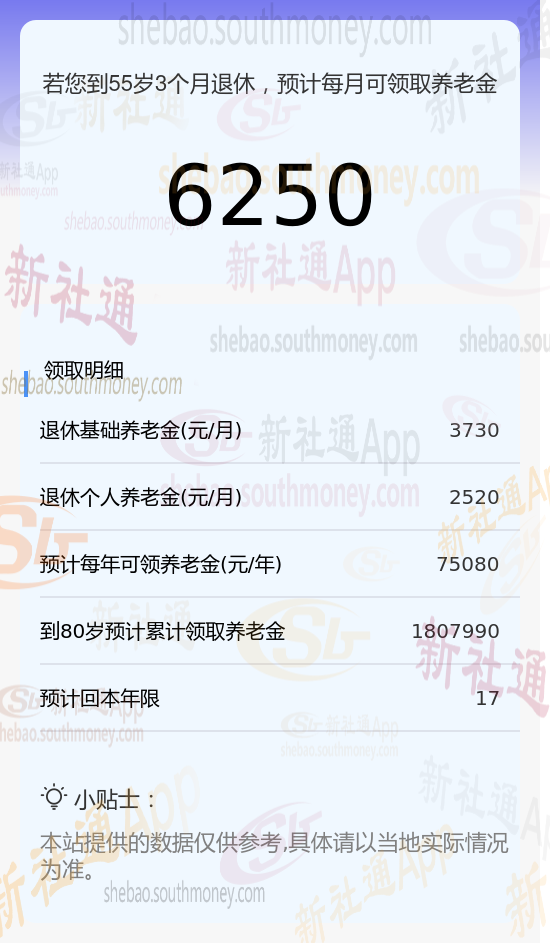 每月可领养老金=基础养老金+个人养老金≈3730+2520≈6250元。