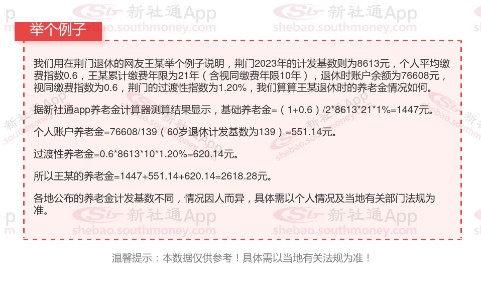我们用荆门退休网友举个例子说明一下,荆门2023年的养老金计发基数为8613元,个人平均缴费指数0.6,该网友累计缴费年限为28年,退休时账户余额为102144元,我们算算这位网友退休能领多少钱。