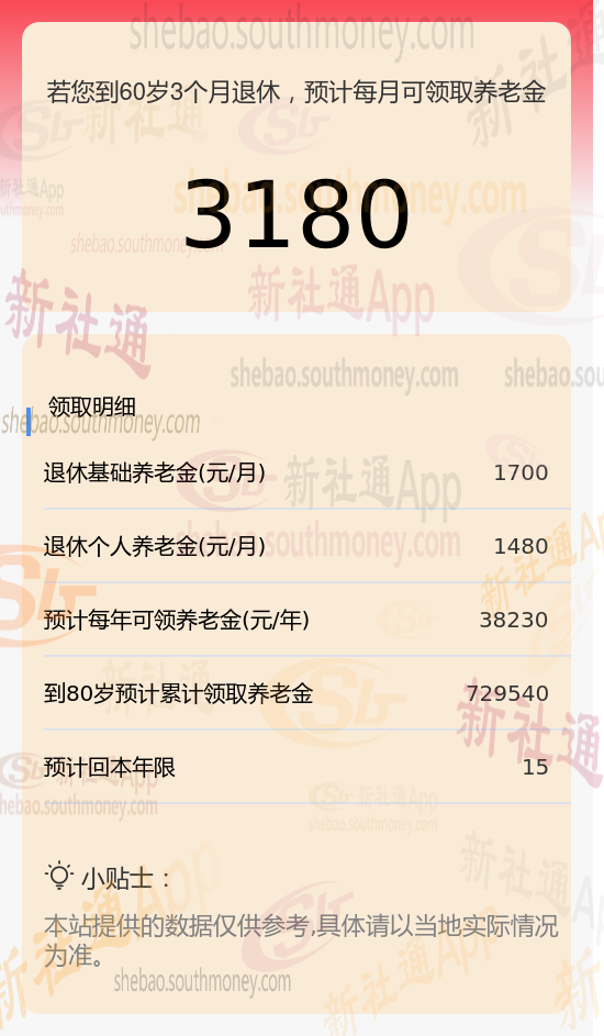 将基础养老金与个人养老金相加,我们得出每月可领取的养老金总额大约为3180元,即1700元(基础养老金)+1480元(个人养老金)。这个数字确定了退休后每月可以获得的稳定养老金收入。