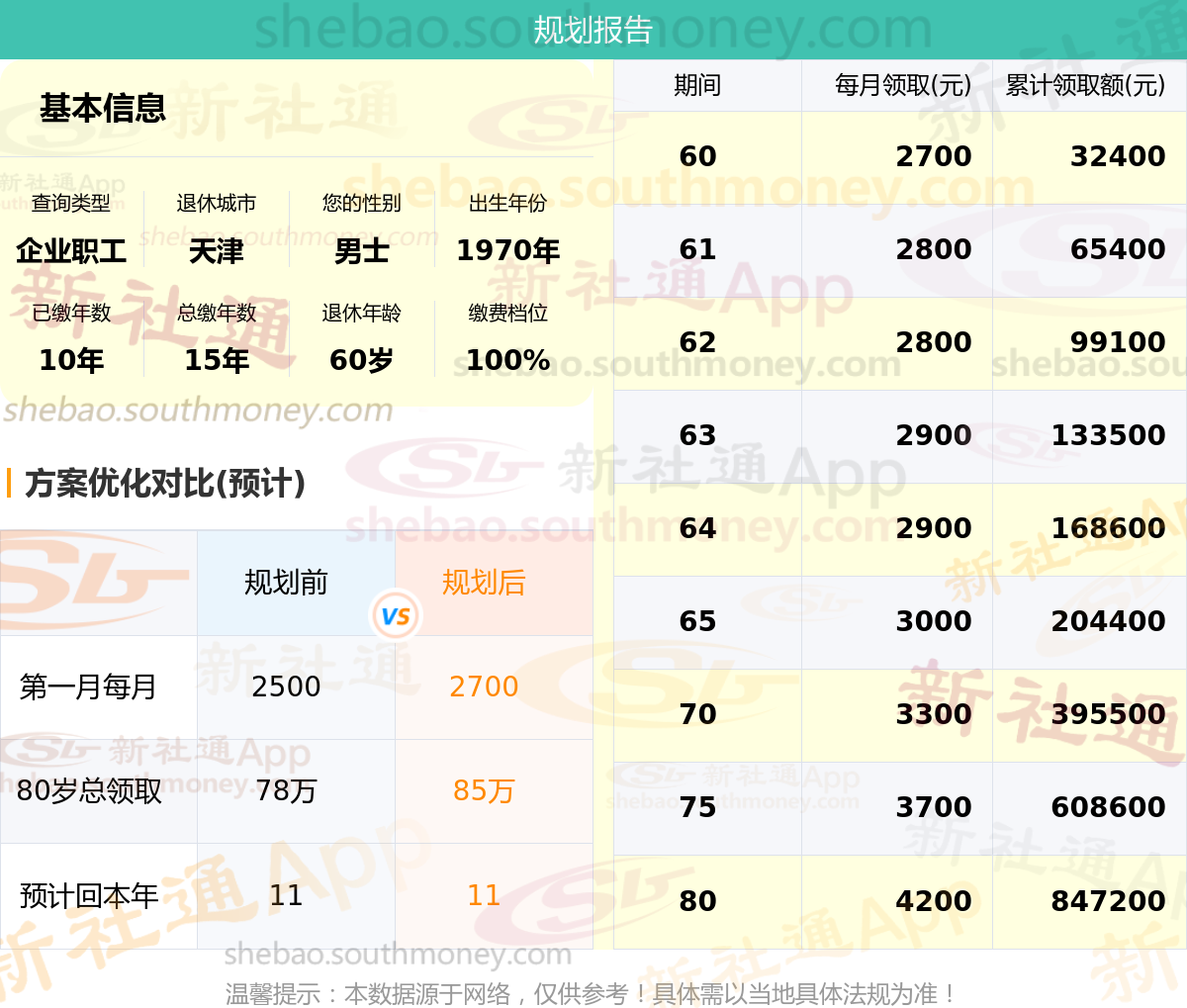 规划前:参保城市:天津,性别:男士,出生年月:1970,已缴年限:10年,总缴年数:15年,退休年龄:60岁,缴费档位:100%。