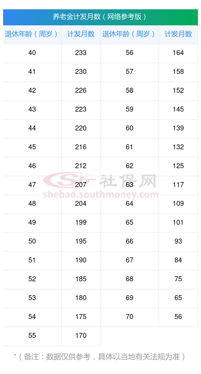 计发月数:这是一个假设值,表示你预计能领取养老金的时间。比如60岁退休的计发月数为139个月,而50岁退休的计发月数为195个月。