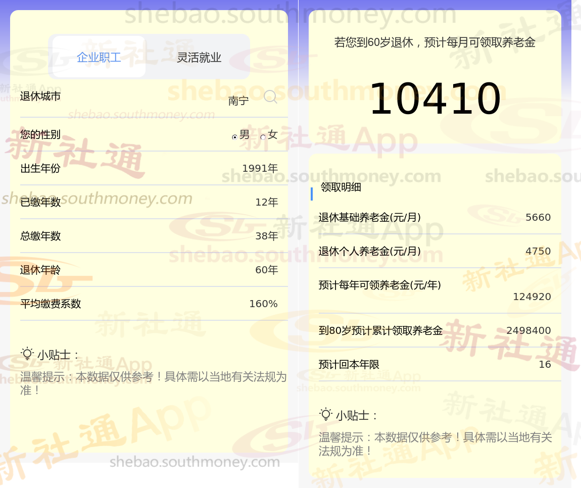 通过新社通APP-养老金计算所得:退休城市、出生年份、退休年龄、缴费系数都相同的情况下,社保缴费年限累计38年时,计算如下: