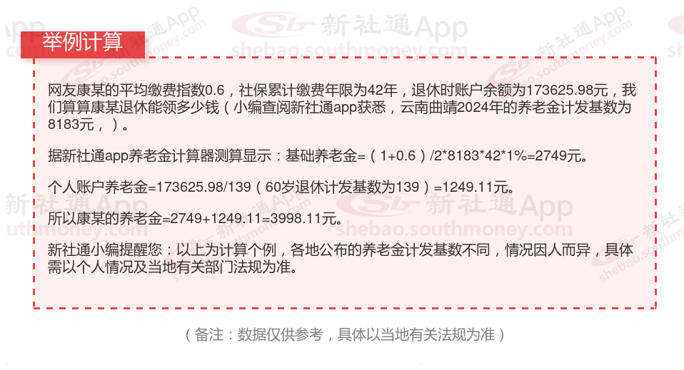 我们用云南曲靖退休网友举个例子说明一下,云南曲靖2024年的养老金计发基数为8183元,个人平均缴费指数0.6,该网友累计缴费年限为35年,退休时账户余额为144688.32元,我们算算这位网友退休能领多少钱。