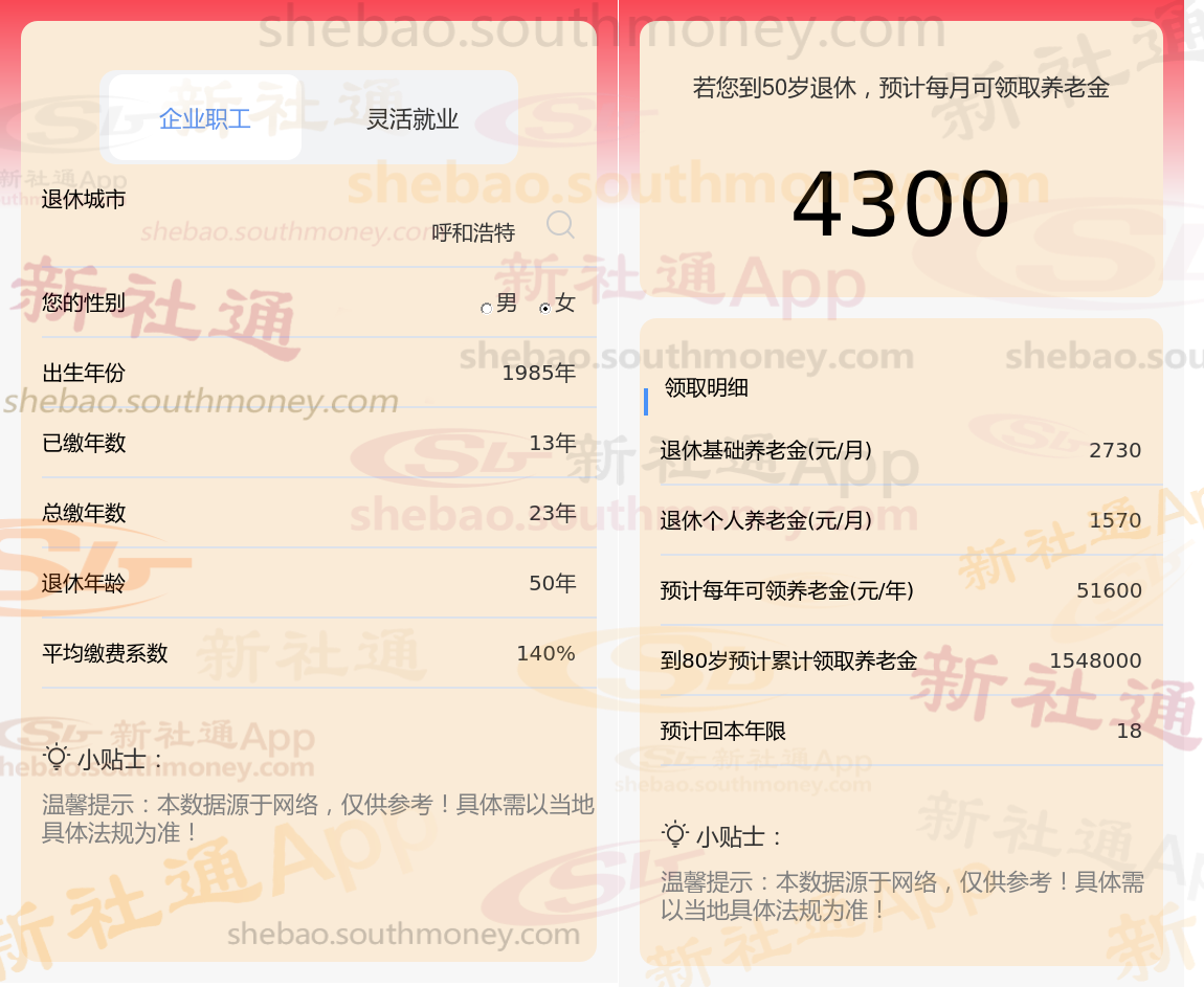 通过新社通APP-养老金计算所得:退休城市、出生年份、退休年龄、缴费系数都相同的情况下,社保缴费年限累计23年时,计算如下: