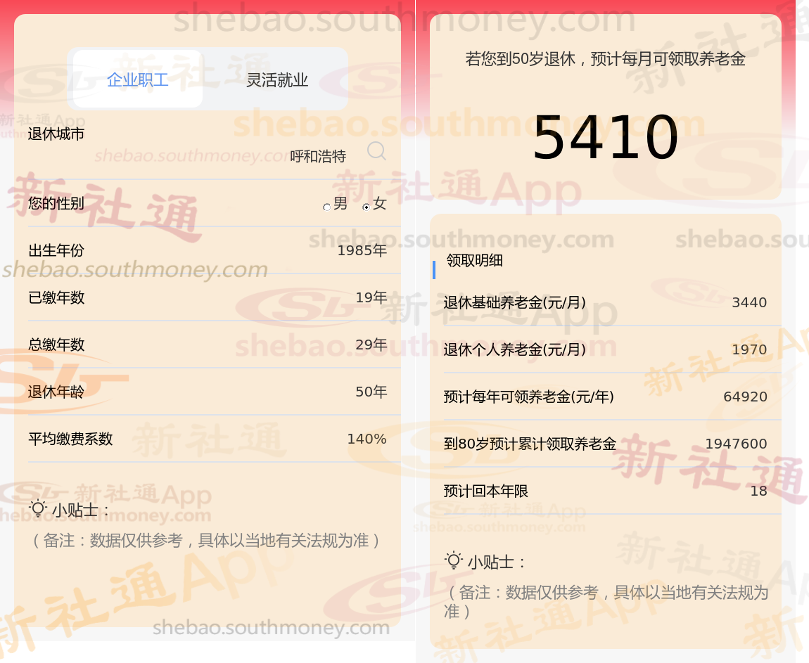 通过新社通APP-养老金计算所得:退休城市、出生年份、退休年龄、缴费系数都相同的情况下,社保缴费年限累计29年时,计算如下: