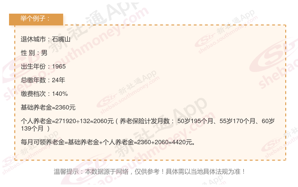 网友谢某退休城市在石嘴山,性别:男,出生年份:1965,总缴年数24年,缴费档次:140%,新社通app养老金计算器所得: