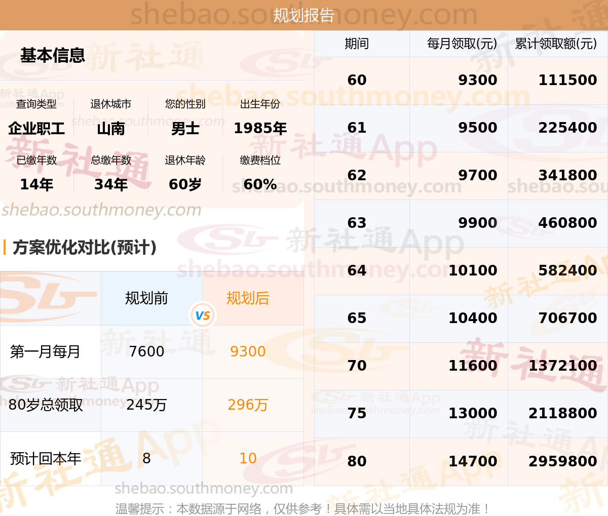 规划前:参保城市:山南,性别:男士,出生年月:1985,已缴年限:14年,总缴年数:34年,退休年龄:60岁,缴费档位:60%。