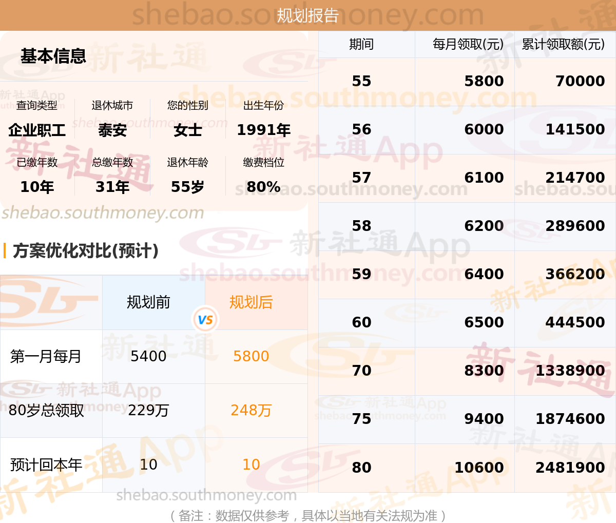规划前:55岁第一个月约领5400元,新社通APP-养老金规划后:55岁第一个月约领5800元