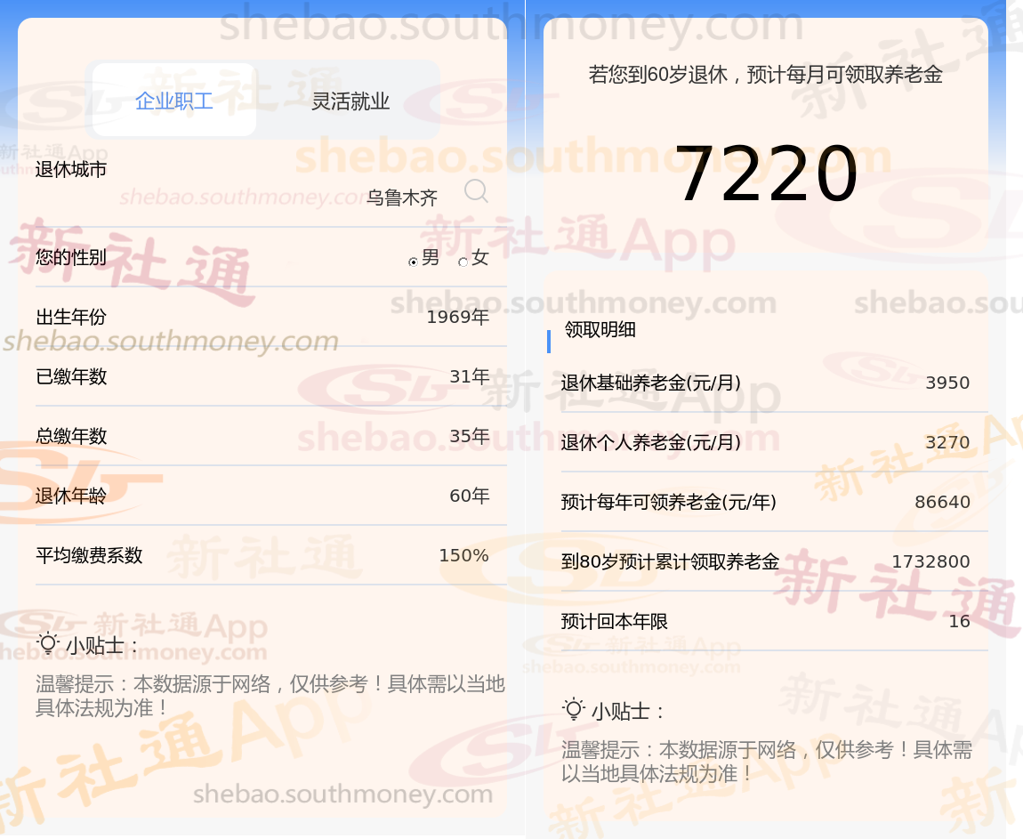 通过新社通APP-养老金计算所得:退休城市、出生年份、退休年龄、缴费系数都相同的情况下,社保缴费年限累计32年时,计算如下: