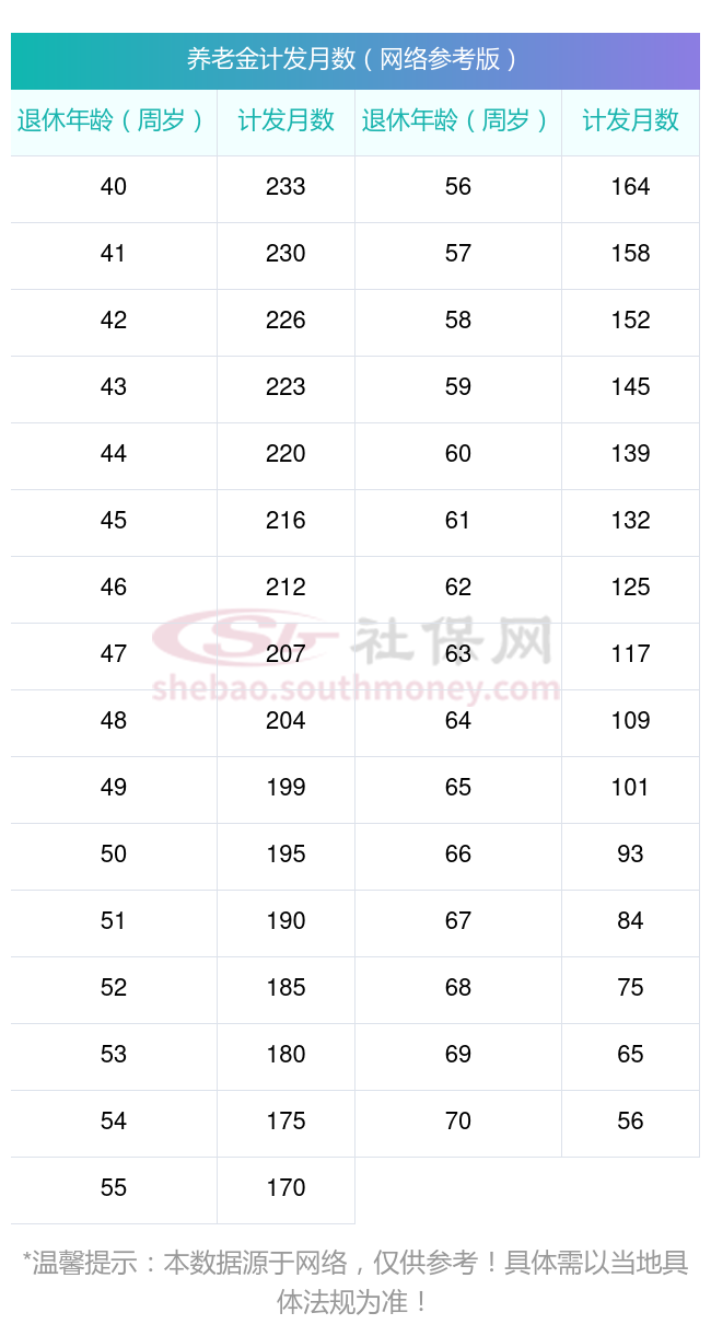 查阅新社通app显示,2025年最新养老金计发月数一览表如下:
