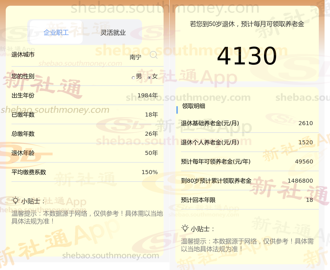 通过新社通APP-养老金计算所得:退休城市、出生年份、退休年龄、缴费系数都相同的情况下,社保缴费年限累计26年时,计算如下: