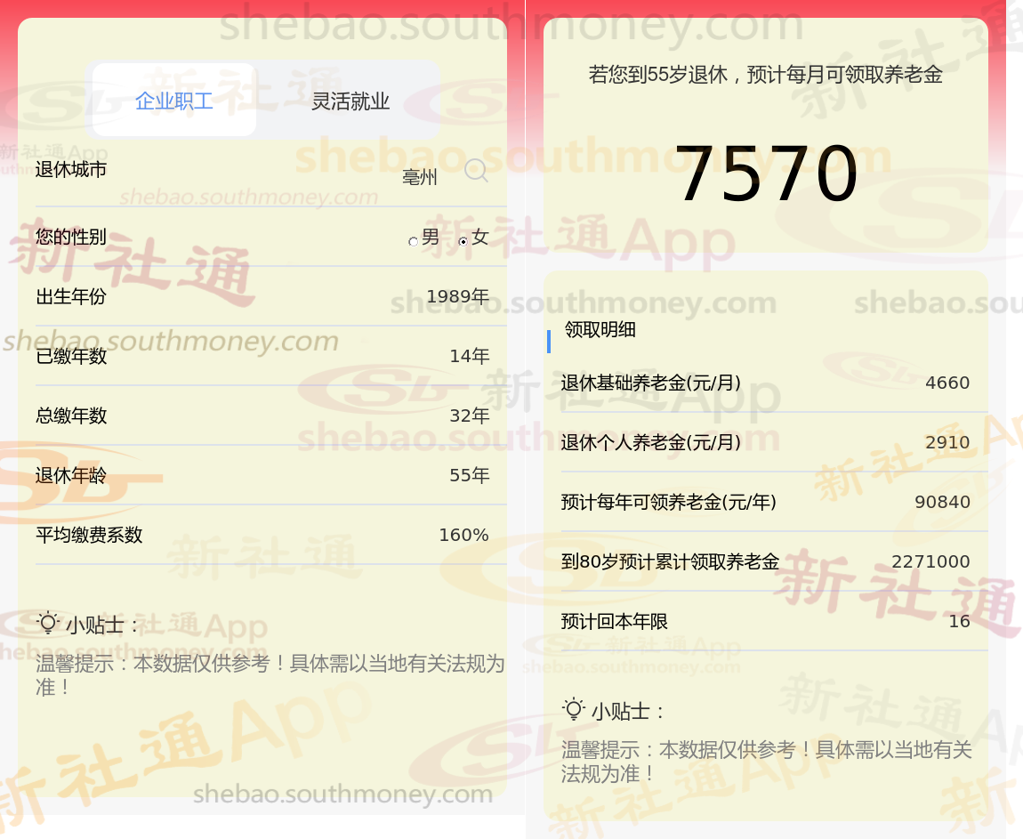 通过新社通APP-养老金计算所得:退休城市、出生年份、退休年龄、缴费系数都相同的情况下,社保缴费年限累计32年时,计算如下: