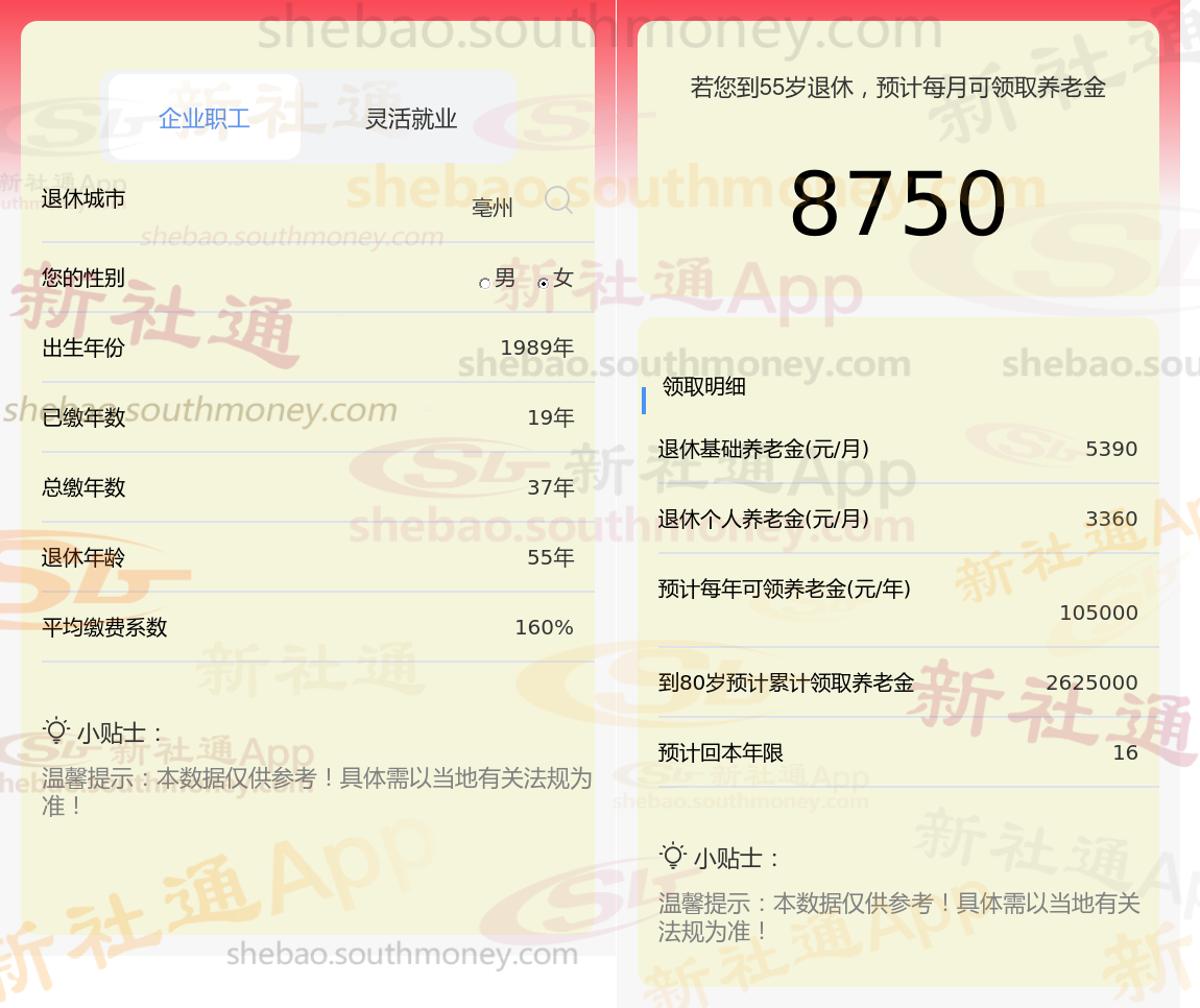 通过新社通APP-养老金计算所得:退休城市、出生年份、退休年龄、缴费系数都相同的情况下,社保缴费年限累计37年时,计算如下: